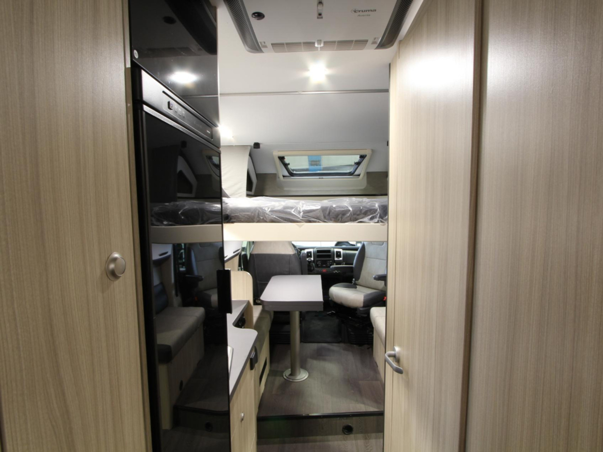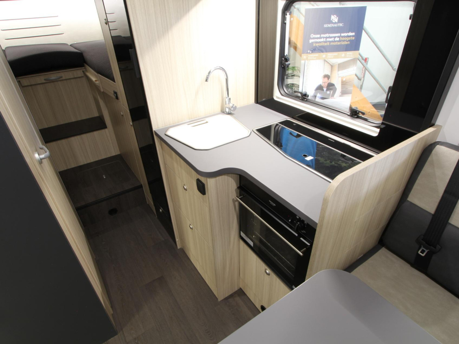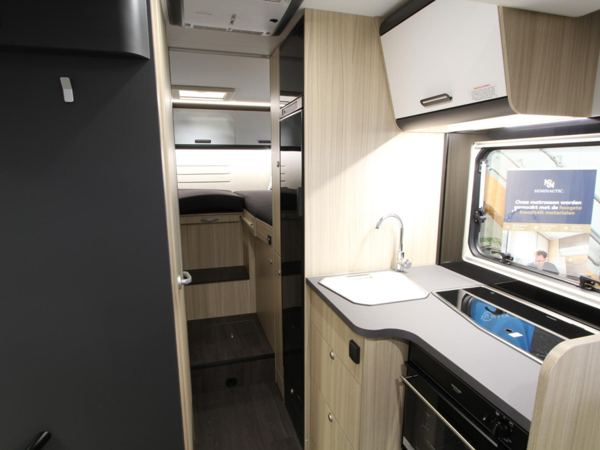 De centraal geplaatste keuken is volledig ingericht met een 3-pits kooktoestel, spoelbak met kraan, 10-liter boiler en een ruime 142-liter koelkast met vriesvak. Zo kookt u onderweg net zo comfortabel als thuis.