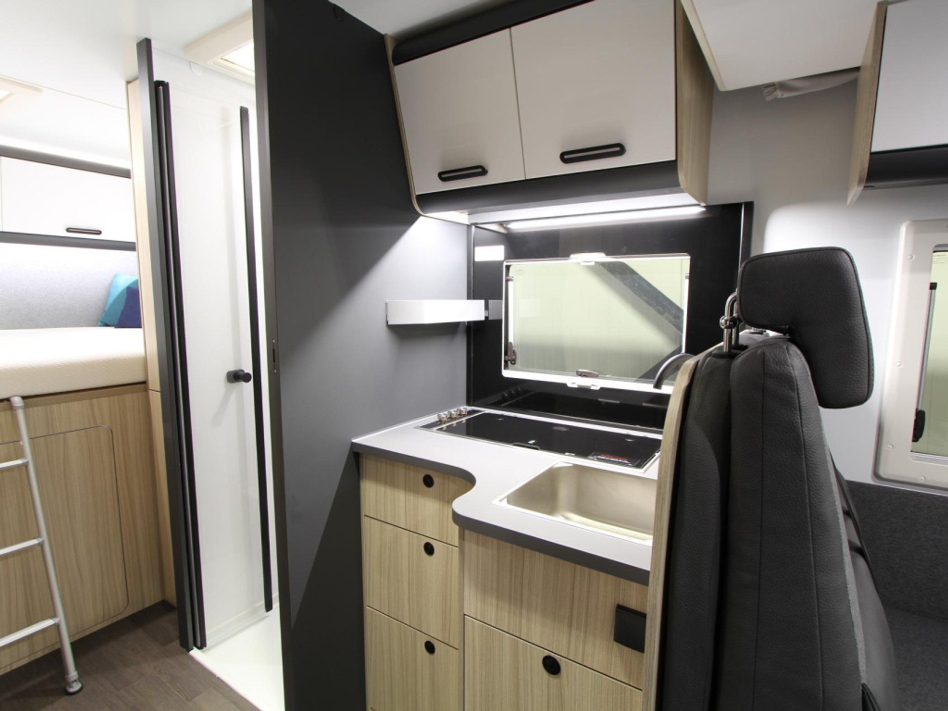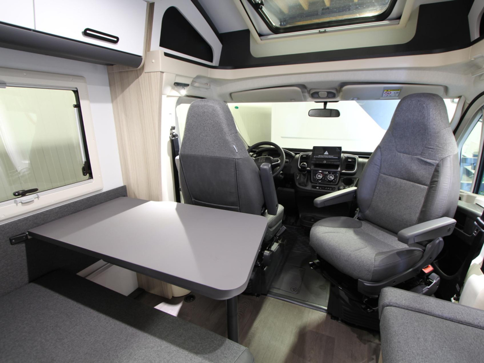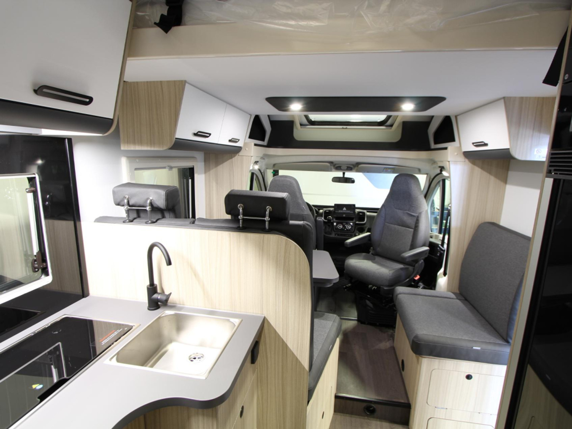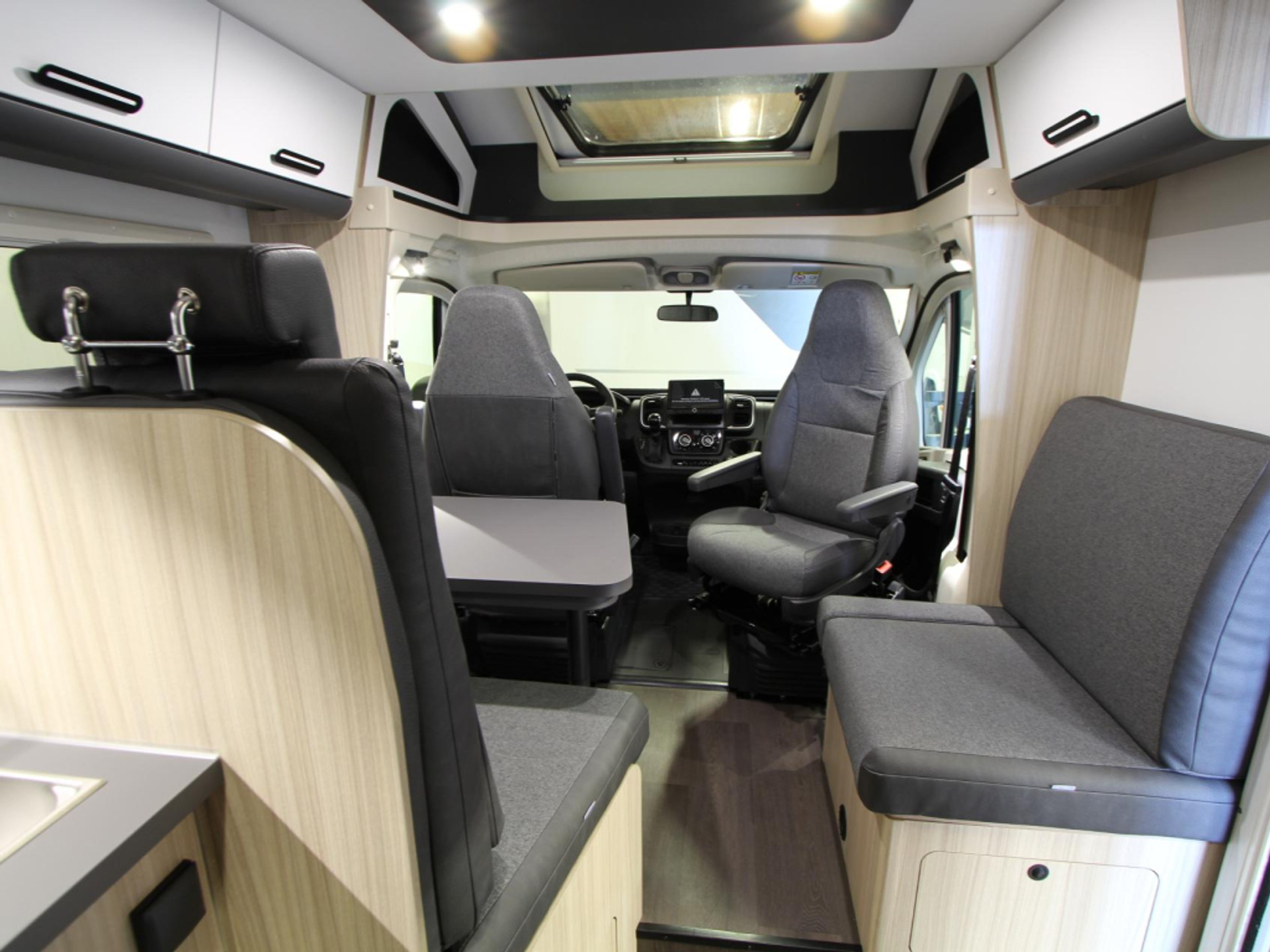 Een gezellige plek om te zitten vindt u in de centrale halve treinzit, deze kan uiteraard ook dienen als extra slaapplaats. Centraal in de camper bevindt zich de middenkeuken, uitgerust met een spoelbak, kraan en 3-pits kooktoestel. Een ingebouwde 10 liter boiler voorziet u van warm water. De ingebouwde koelkast (157 liter) met vriesvak is uitgevoerd in een extra grote XL uitvoering.