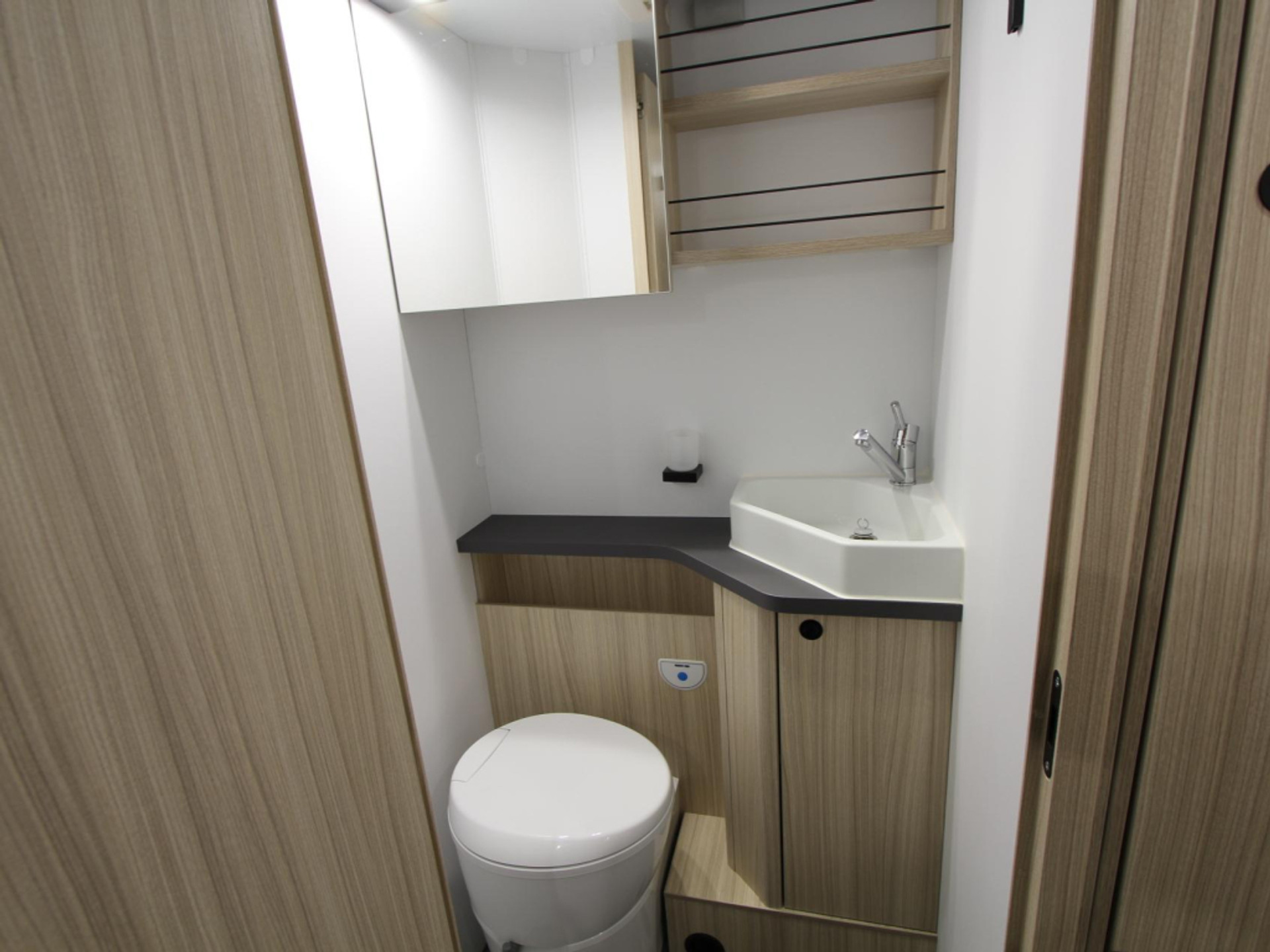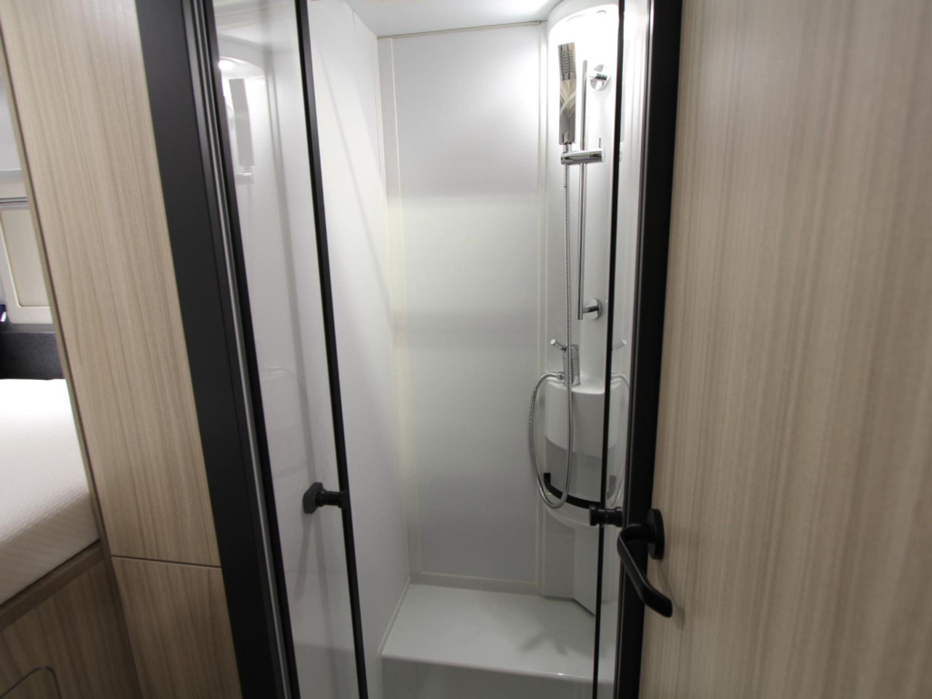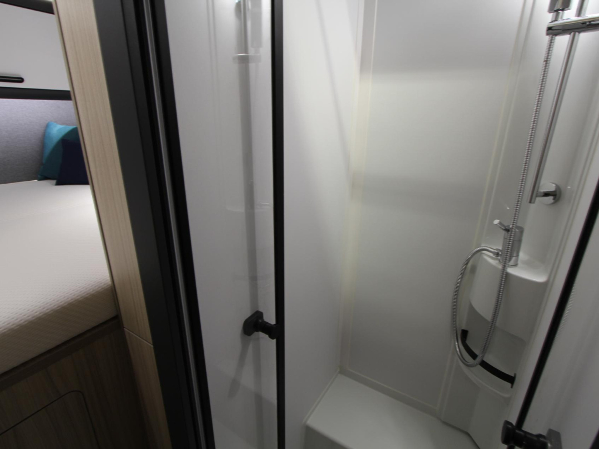 Boven de zitgroep bevindt zich een ruimtebesparend hefbed, waar 2 personen kunnen slapen. Behalve een cassettetoilet heeft de badkamer ook een wastafel, waar u zich heerlijk op kunt frissen. Er is bovendien een doucheruimte in de camper, zodat u van uw eigen douche gebruik kunt maken.