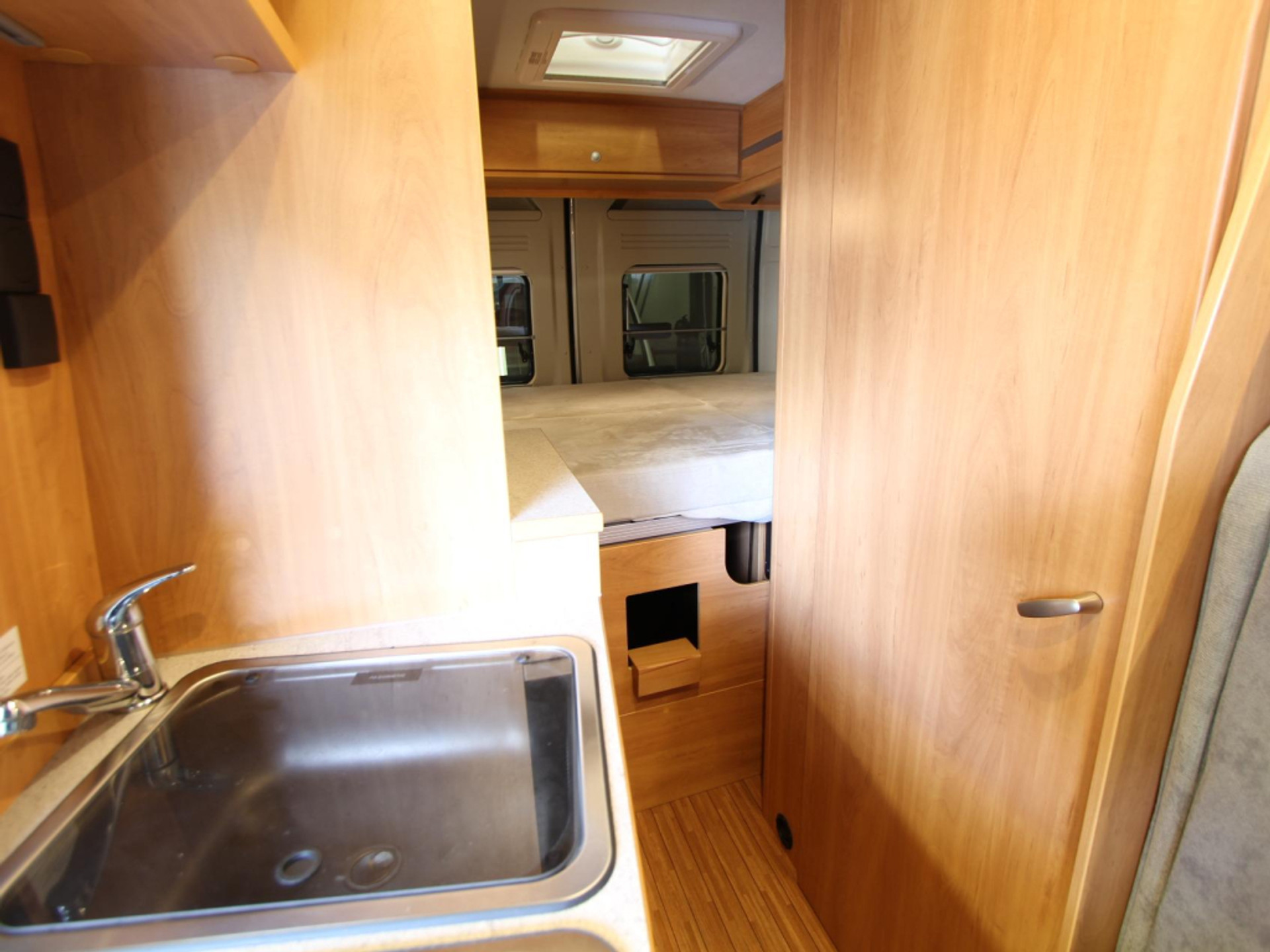 Binnen vindt u een gezellige treinzit die ook als extra slaapplaats dient. De centraal gelegen middenkeuken beschikt over een spoelbak, kraan, 2-pits kooktoestel, 10-liter boiler en een koelkast met vriesvak.
