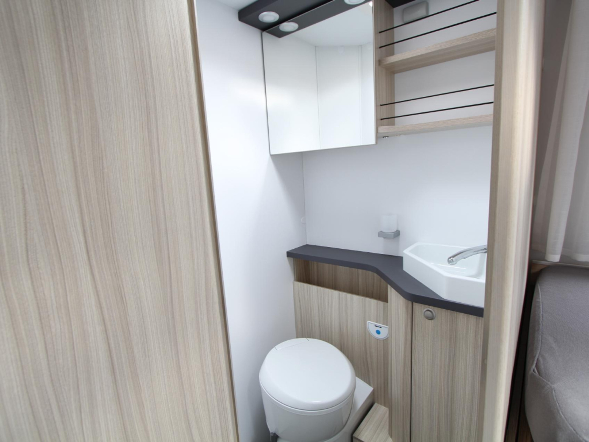 Het interieur beschikt over een ruim tweepersoonsbed in de lengte en een handig ruimtebesparend hefbed boven de zitgroep, beide voorzien van comfortabele lattenbodems en traagschuimmatrassen. In de badkamer vindt u een wastafel, een cassettetoilet en een douchecabine, zodat u onderweg altijd lekker kunt opfrissen.