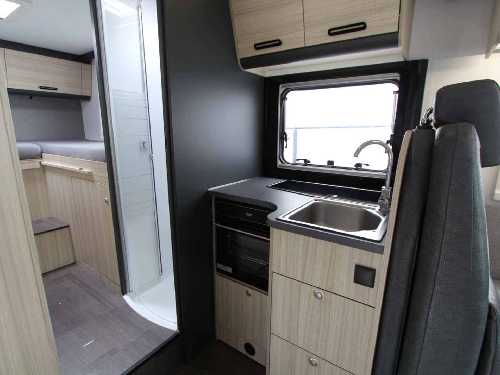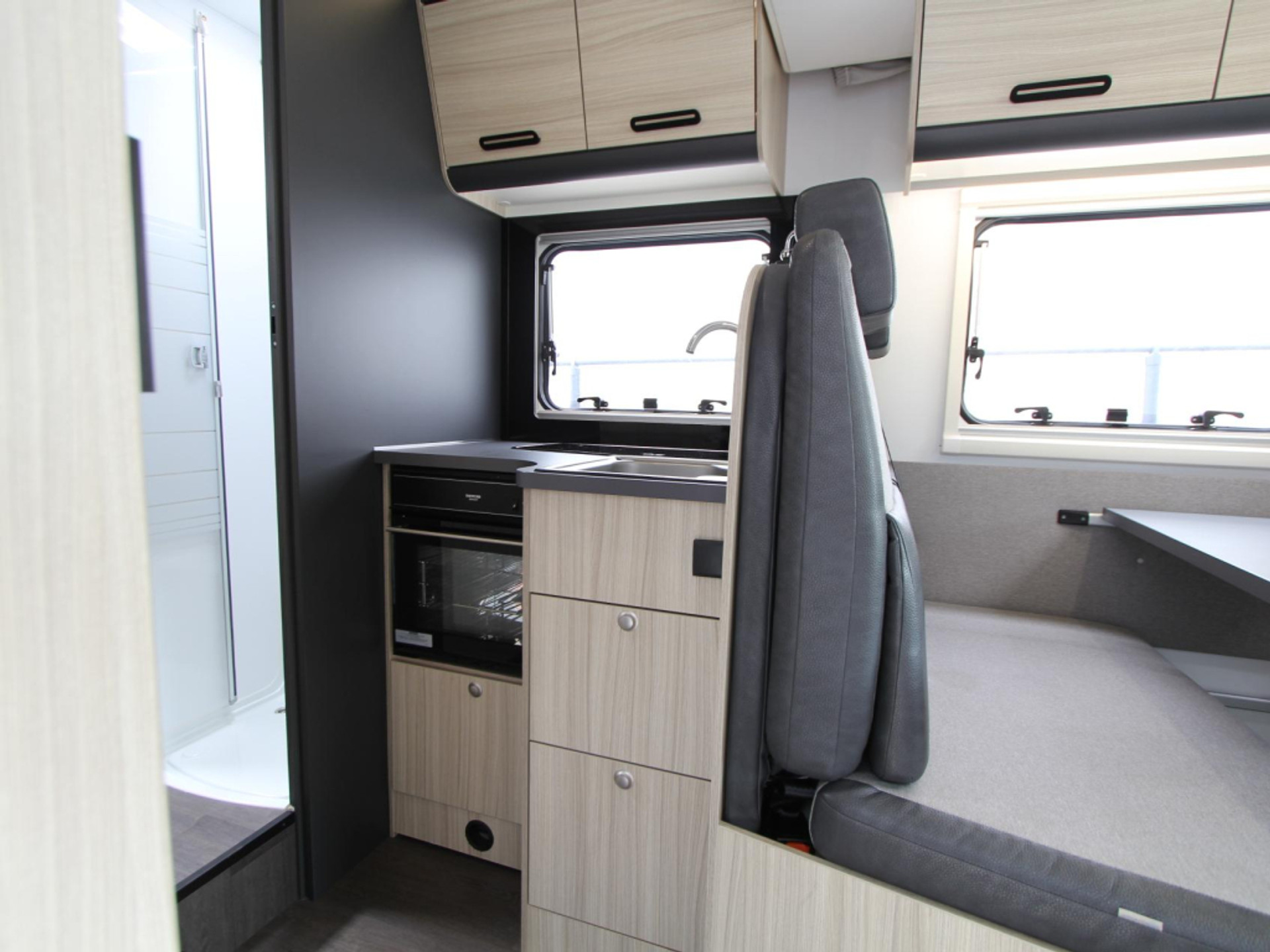 De gezellige treinzit biedt niet alleen een fijne plek om te ontspannen, maar fungeert ook als extra slaapgelegenheid. De middenkeuken is voorzien van een 3-pits kooktoestel, spoelbak, kraan en een 10-liter boiler voor warm water. De koelkast met vriesvak biedt voldoende ruimte voor al uw boodschappen.
