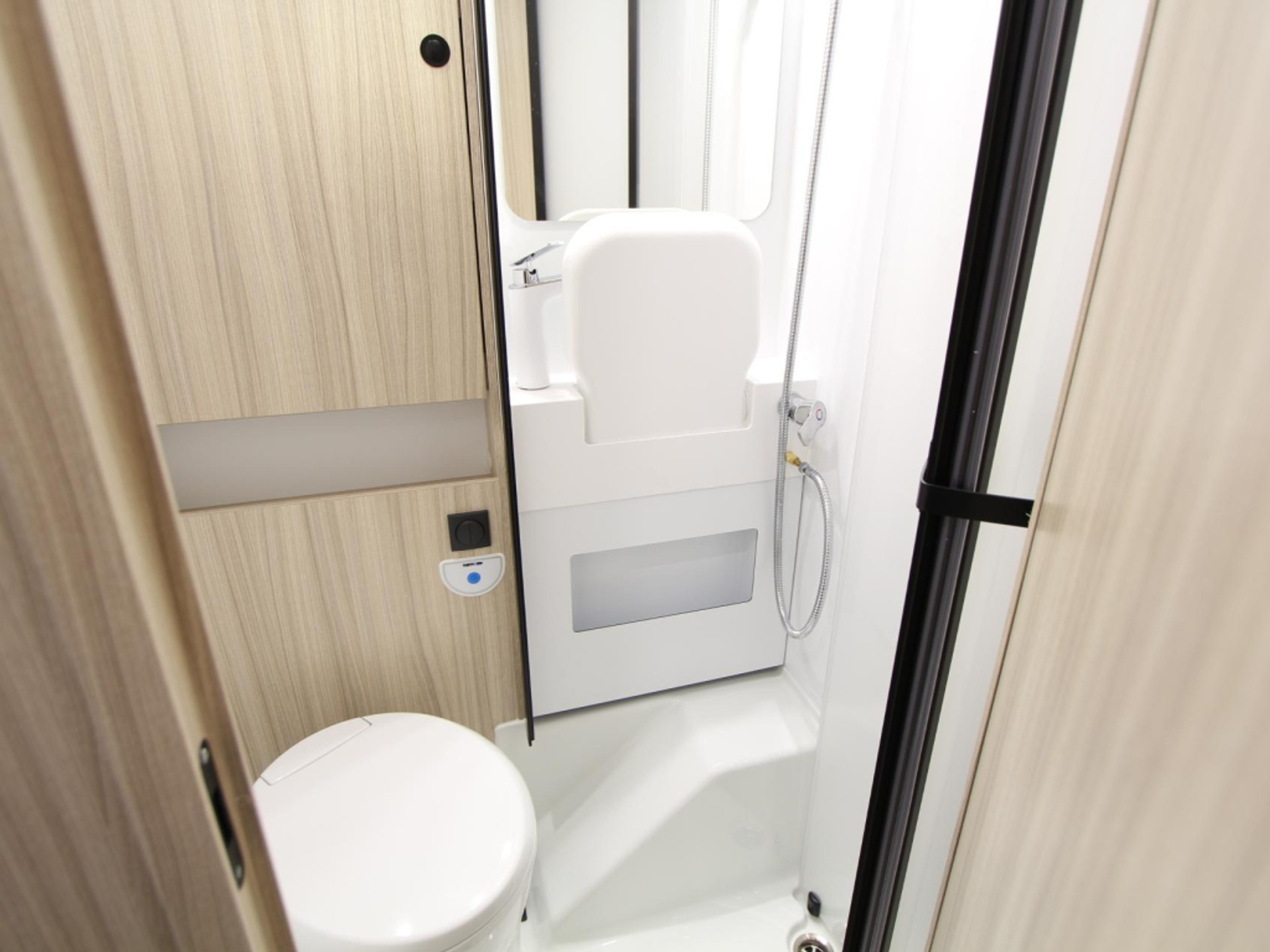 Achterin vindt u een ruim tweepersoonsbed in lengterichting. De badkamer beschikt over een cassettetoilet, wastafel en een douchecabine – ideaal om u onderweg even op te frissen.