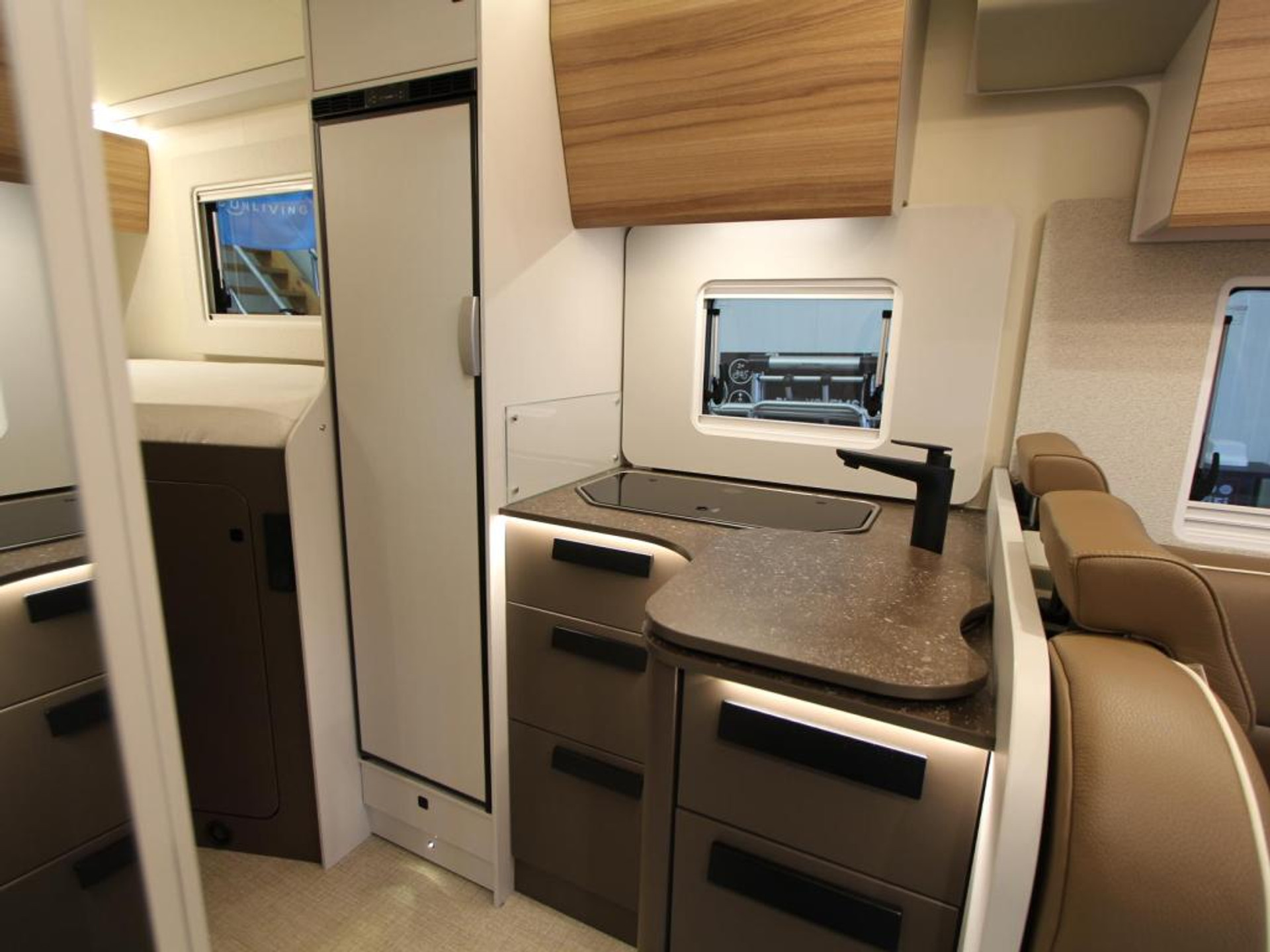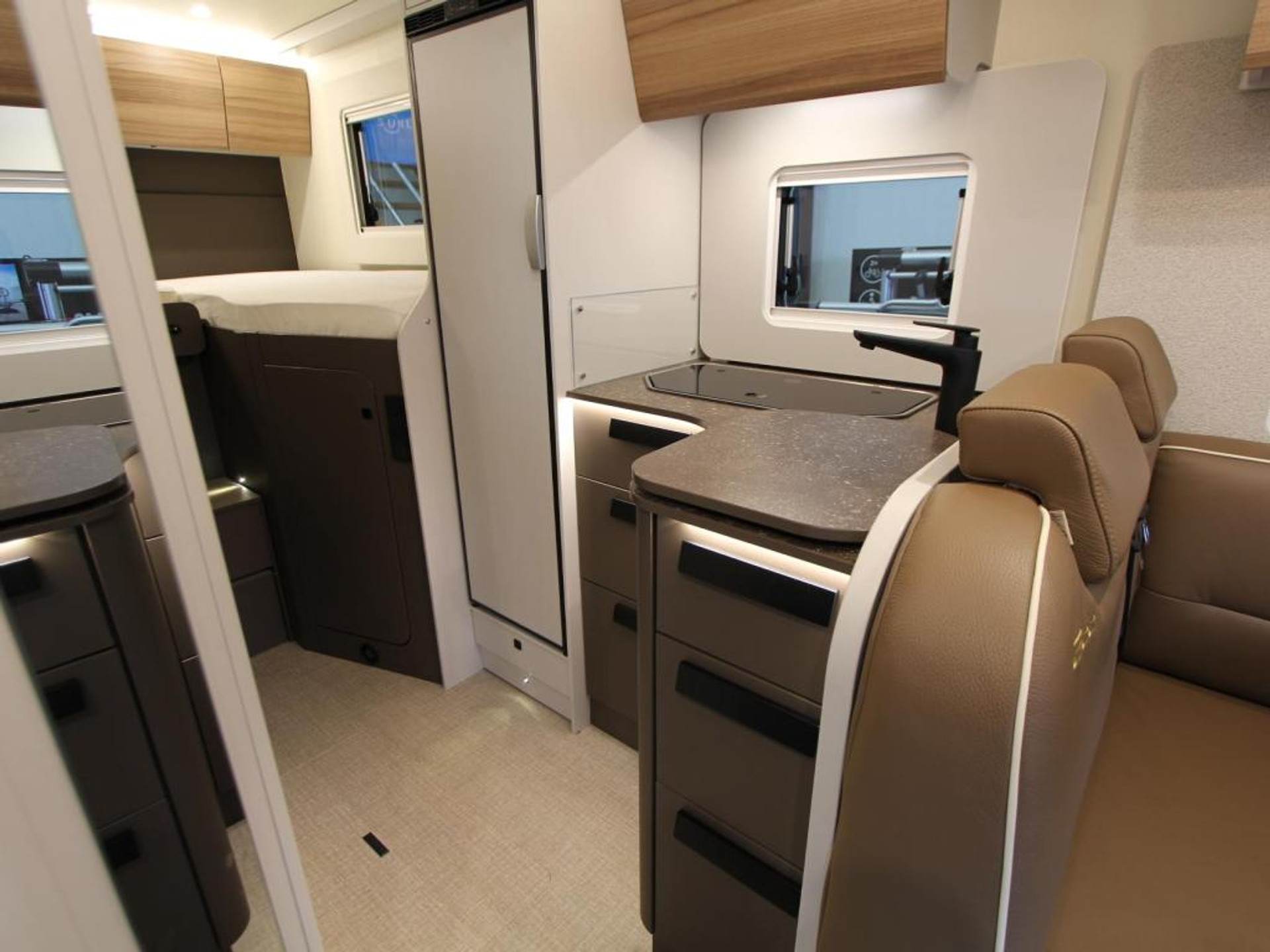 De centrale keuken is compleet uitgerust met een 3-pits kooktoestel, spoelbak met kraan, 10-liter boiler voor warm water en een ruime koelkast van 132 liter met vriesvak – alles wat u nodig heeft voor heerlijke maaltijden onderweg.