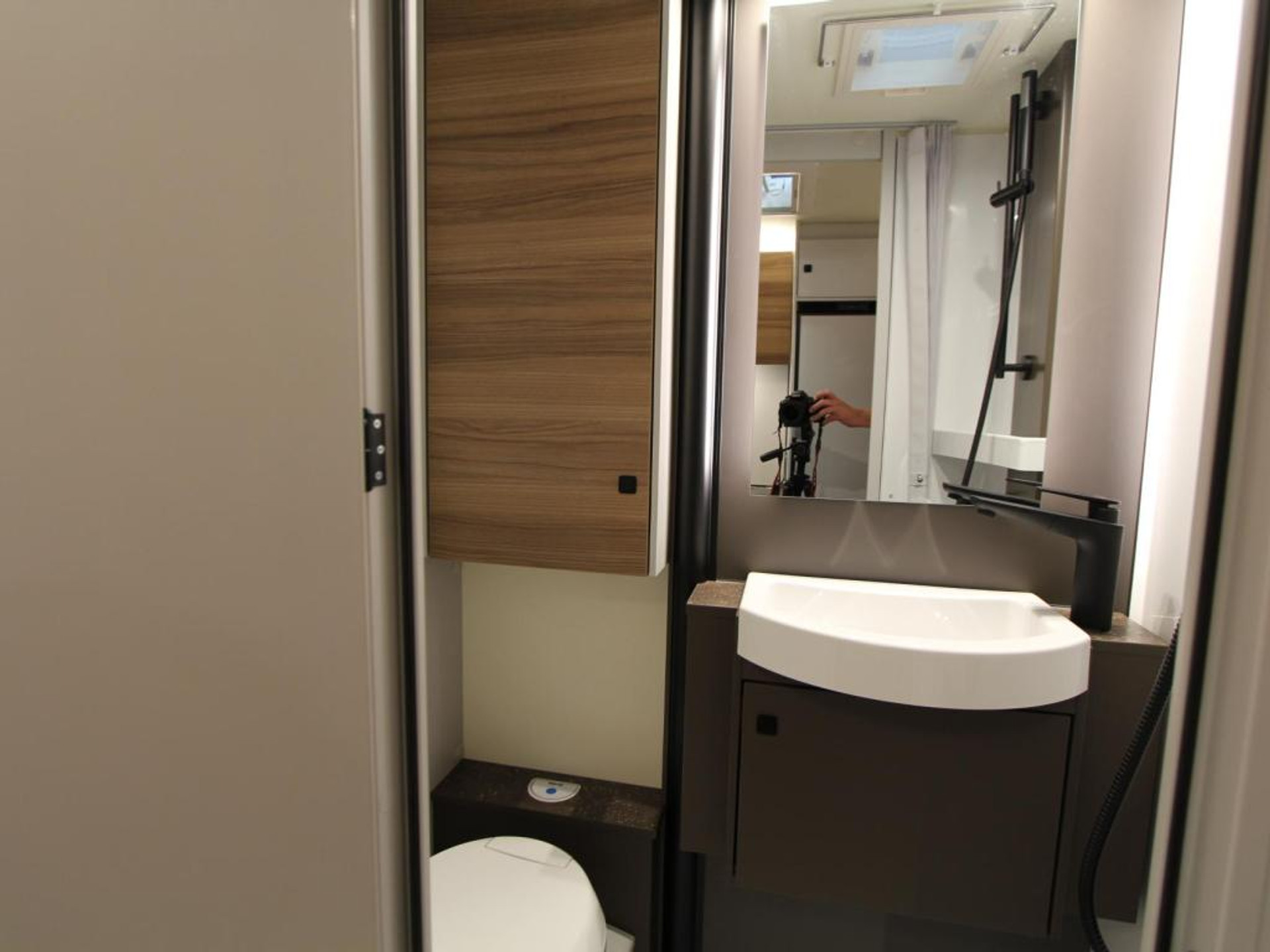De badkamer is uitgerust met een wastafel, cassettetoilet en een aparte douchegelegenheid.