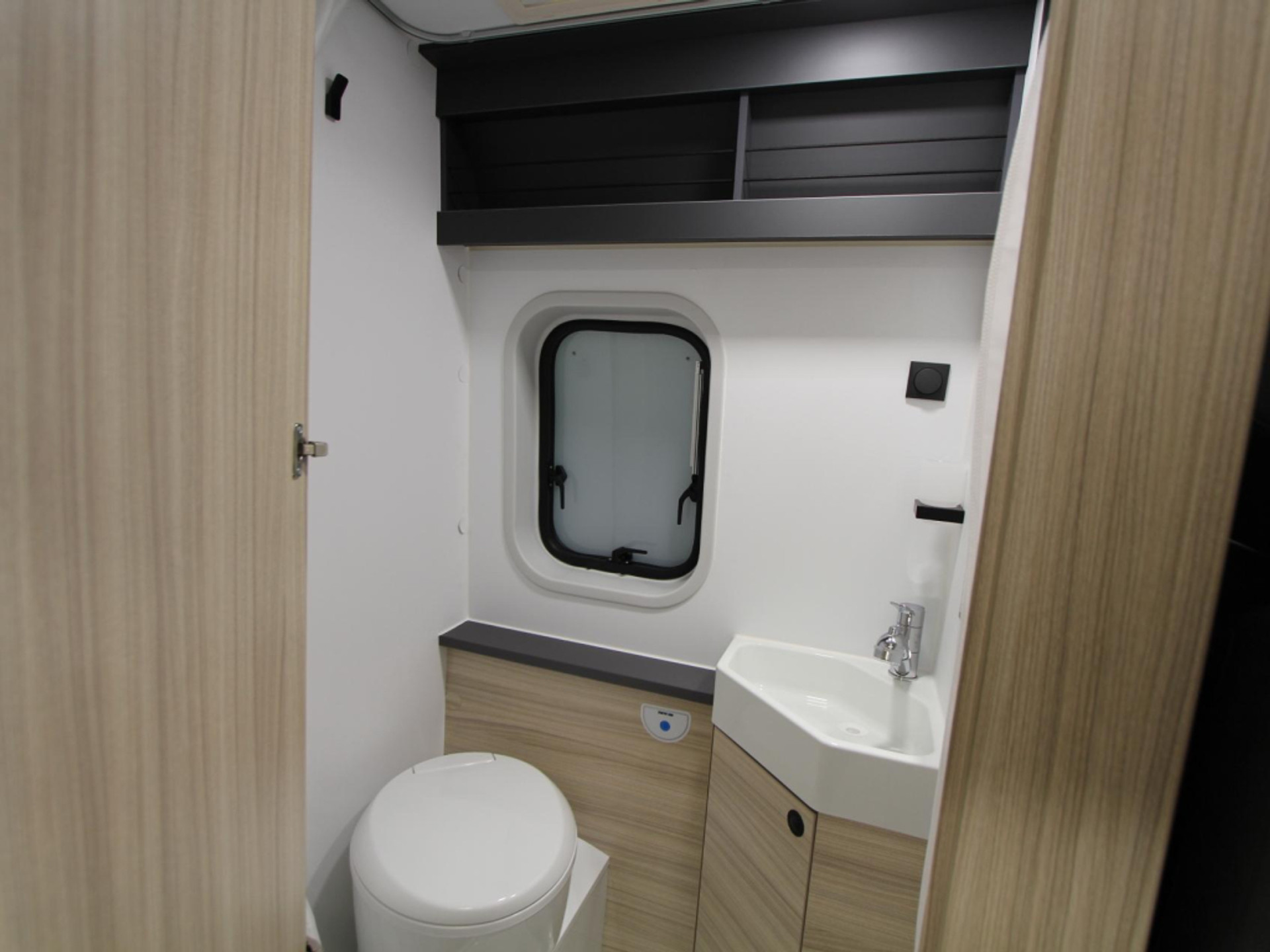 De camper beschikt over een volwaardige badkamer met wastafel, ingebouwd cassettetoilet en een douche, zodat u zich ook onderweg comfortabel kunt opfrissen.