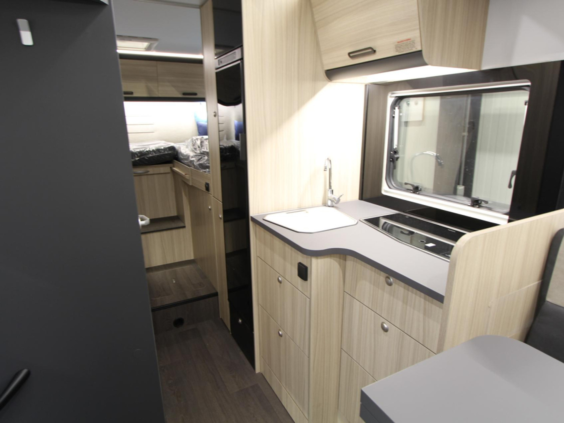 De middenkeuken is volledig ingericht met een 3-pits kooktoestel, spoelbak, kraan en een 142 liter koelkast met vriesvak. De 10 liter boiler voorziet u altijd van warm water, ideaal voor langere reizen.