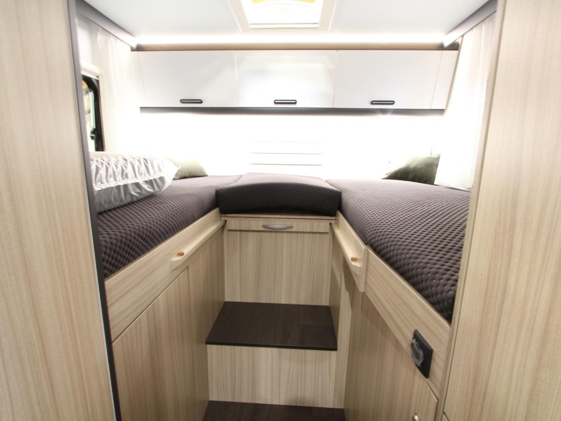 In het slaapgedeelte vindt u een ruim lengtetweepersoonsbed. Daarnaast is er een extra hefbed voor twee personen, wat zorgt voor optimale ruimtebenutting. De lattenbodems en comfortabele traagschuimmatrassen garanderen een uitstekende nachtrust.