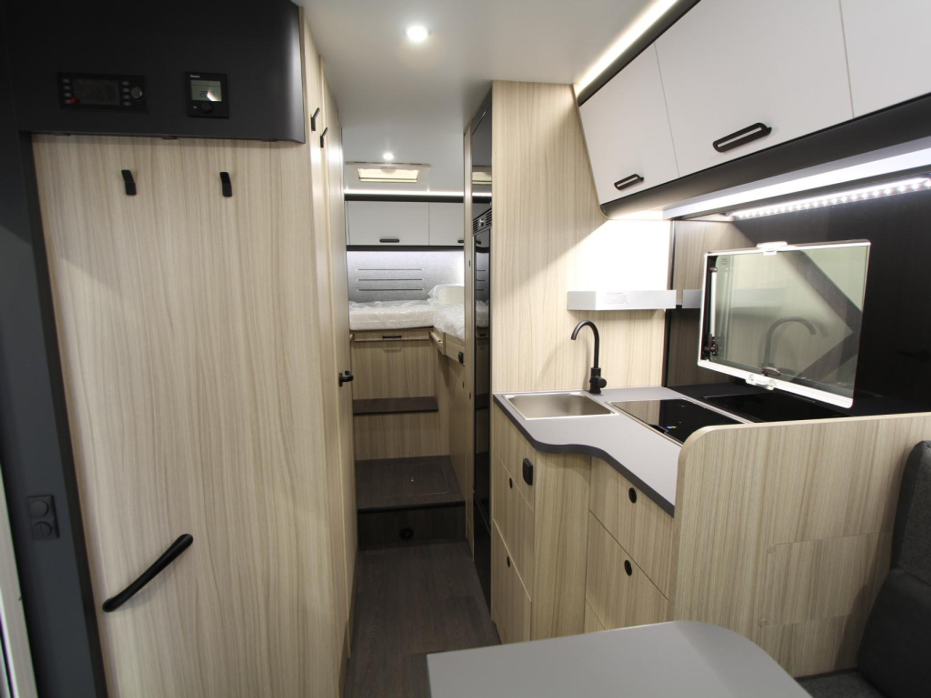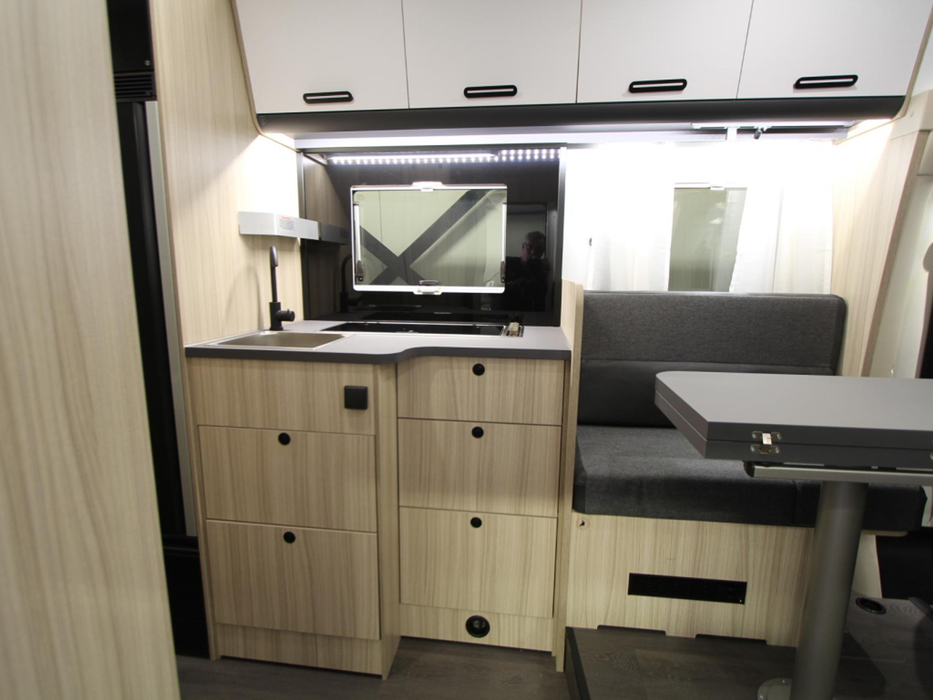 De praktische en compleet uitgeruste keuken beschikt over een 3-pits gasfornuis, spoelbak en een ruime XL koelkast van 157 liter met vriescompartiment. Voor warm water is een 10 liter boiler aanwezig, zodat u onderweg altijd over warm water beschikt.