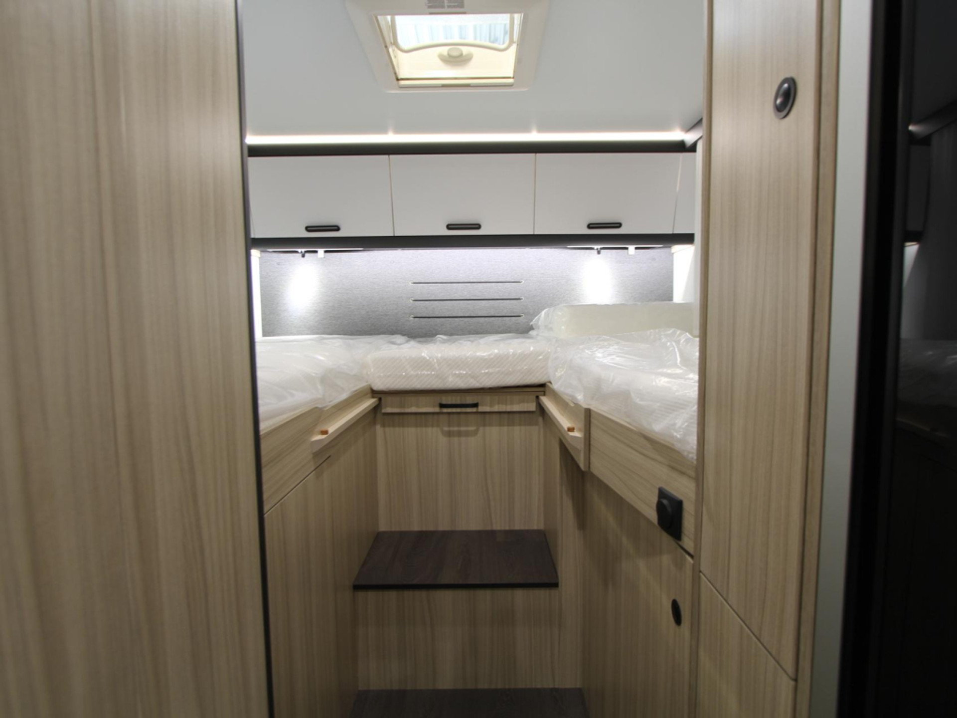 Achterin de camper bevinden zich twee comfortabele lengtebedden die samen een ruim tweepersoonsbed kunnen vormen. Dankzij de lattenbodems en traagschuimmatrassen geniet u van optimaal slaapcomfort tijdens uw reis.