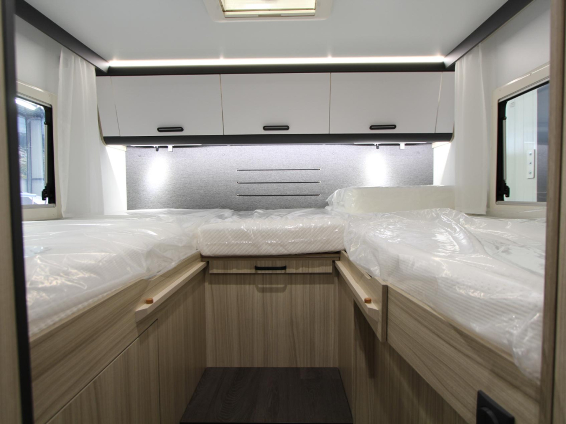 Achterin de camper bevinden zich twee comfortabele lengtebedden die samen een ruim tweepersoonsbed kunnen vormen. Dankzij de lattenbodems en traagschuimmatrassen geniet u van optimaal slaapcomfort tijdens uw reis.
