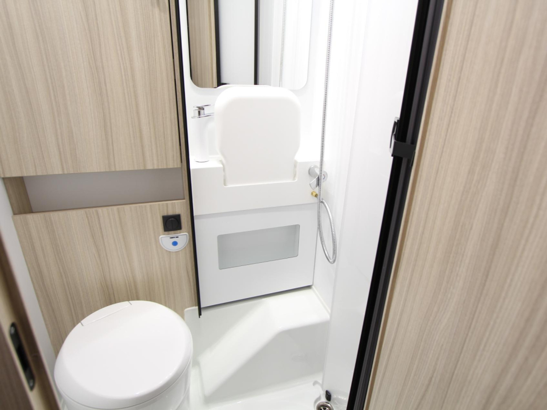 De badkamer is praktisch ingericht met een wastafel, cassettetoilet en douche. Zo kunt u zich onderweg altijd comfortabel opfrissen. De doucheruimte bevindt zich naast het slaapgedeelte.