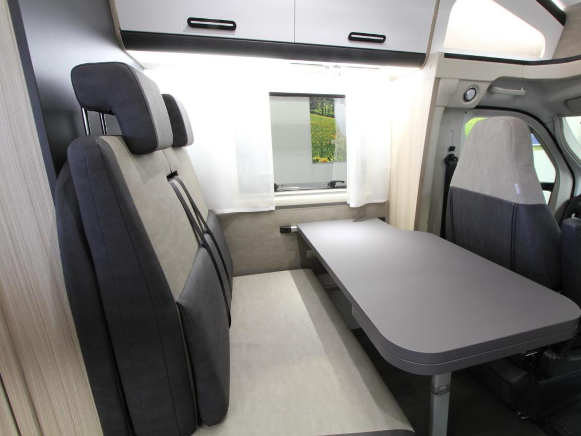De treinzit is ruimtelijk en een gezellige plek om te zitten. De keuken is in het midden van de camper geplaatst en beschikt over een 3-pits kooktoestel en gootsteen met kraan. Voor een snelle toevoer van warm water is er een 10 liter boiler aanwezig. De praktische inbouwkoelkast (70 liter) is tevens voorzien van een vriescompartiment.