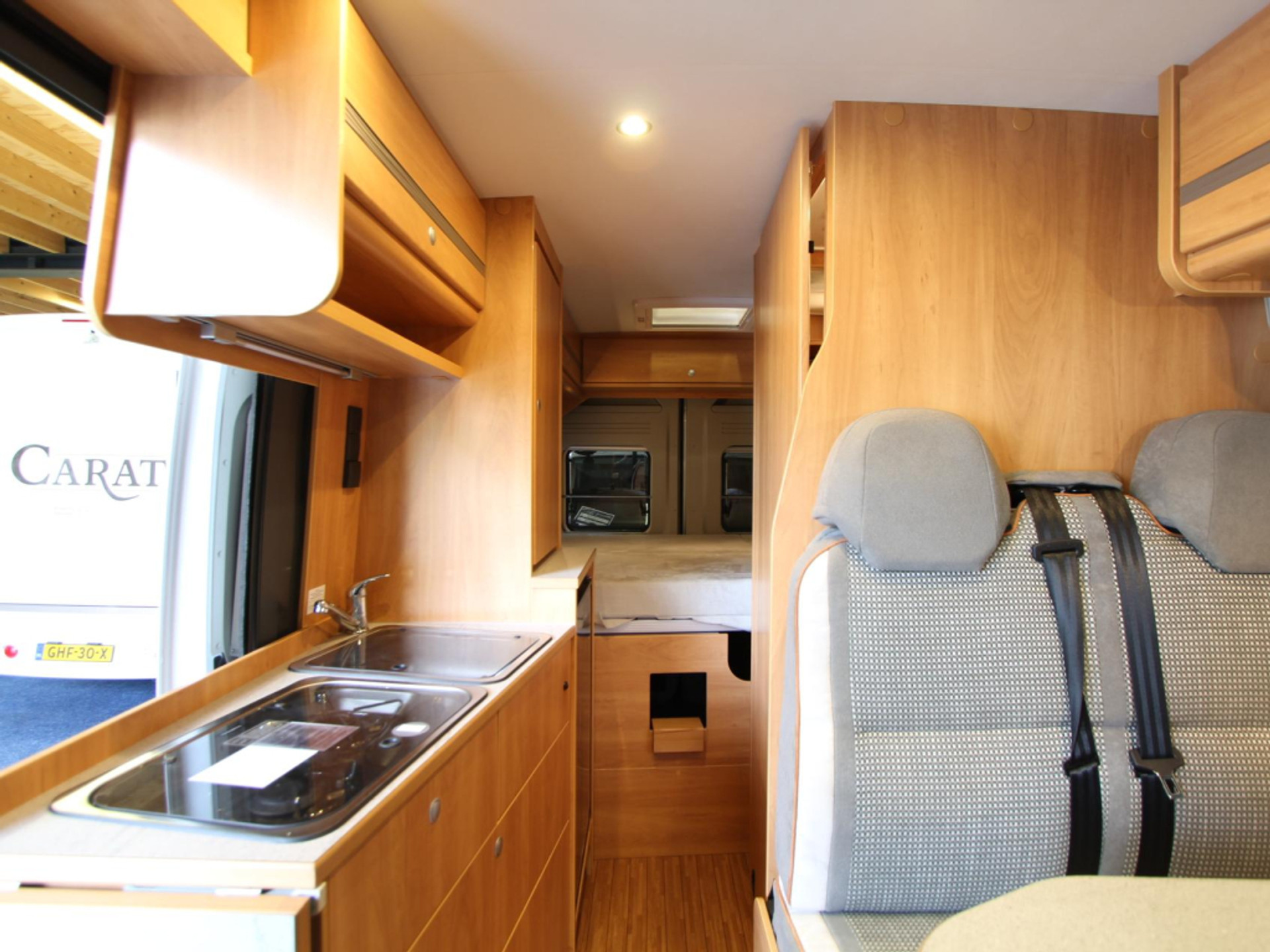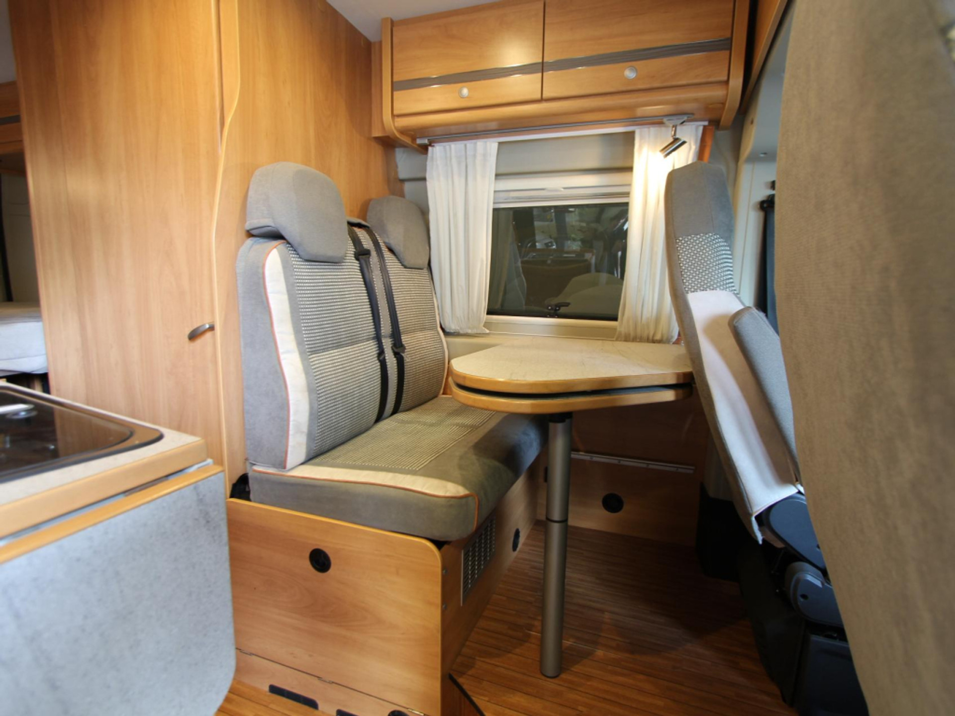 Binnen vindt u een gezellige treinzit die ook als extra slaapplaats dient. De centraal gelegen middenkeuken beschikt over een spoelbak, kraan, 2-pits kooktoestel, 10-liter boiler en een koelkast met vriesvak.