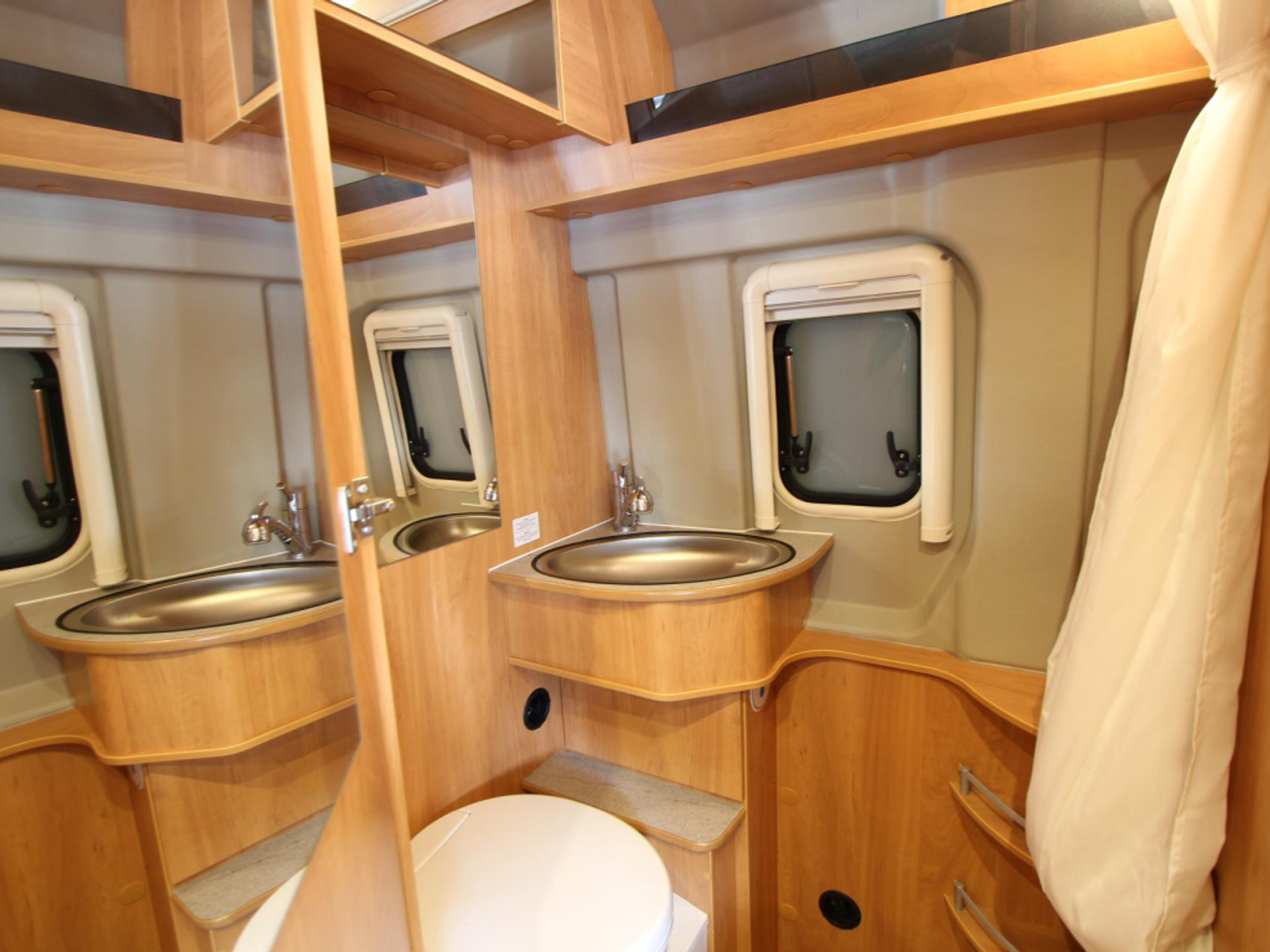 De badkamer is volledig uitgerust met een wastafel, douche en cassettetoilet, zodat u onderweg altijd comfortabel kunt opfrissen. Voor een aangename temperatuur zorgt het circulatiesysteem dat de verwarmde lucht gelijkmatig verdeelt.