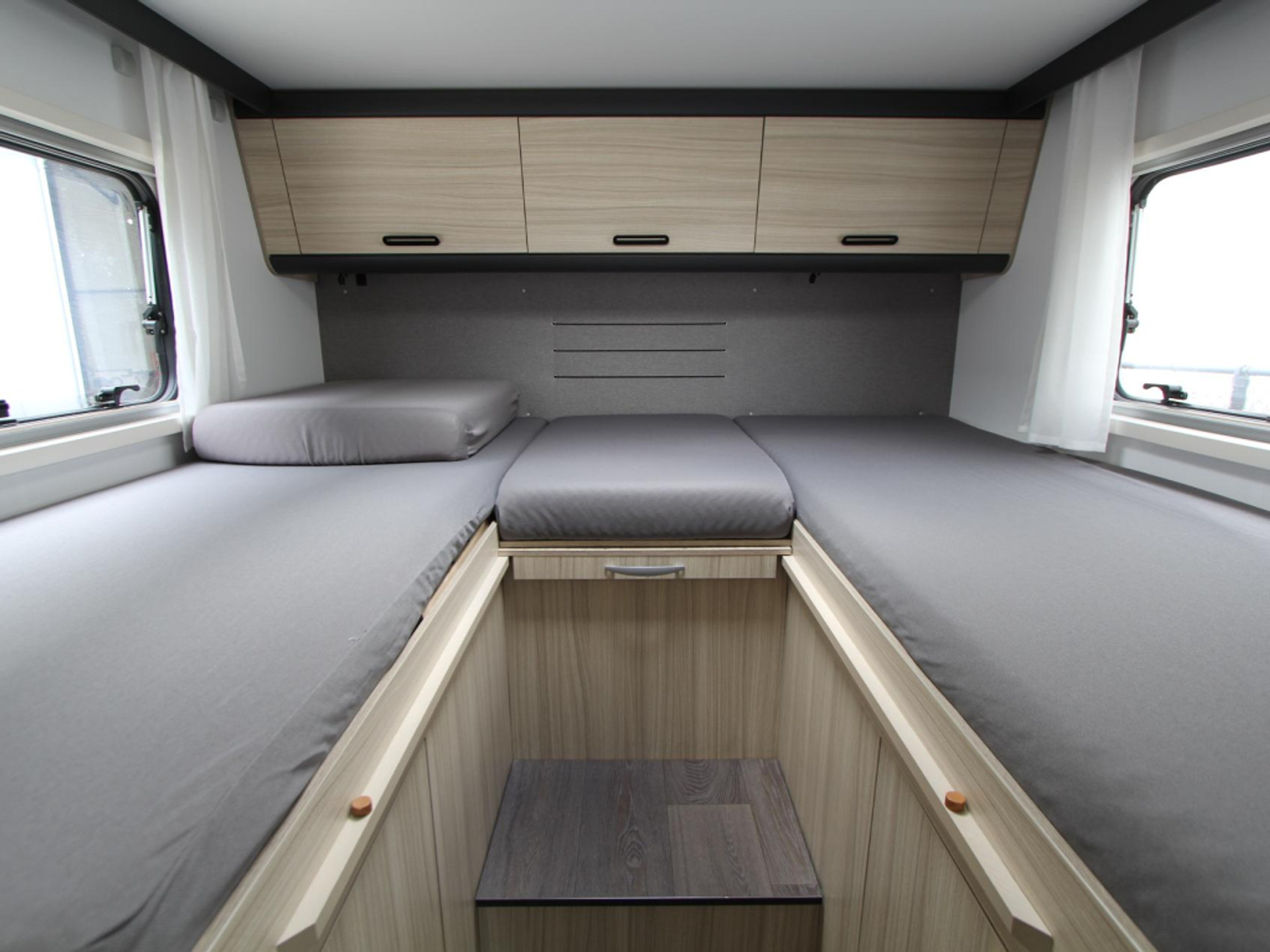 De gezellige treinzit biedt niet alleen een fijne plek om te ontspannen, maar fungeert ook als extra slaapgelegenheid. De middenkeuken is voorzien van een 3-pits kooktoestel, spoelbak, kraan en een 10-liter boiler voor warm water. De koelkast met vriesvak biedt voldoende ruimte voor al uw boodschappen.
