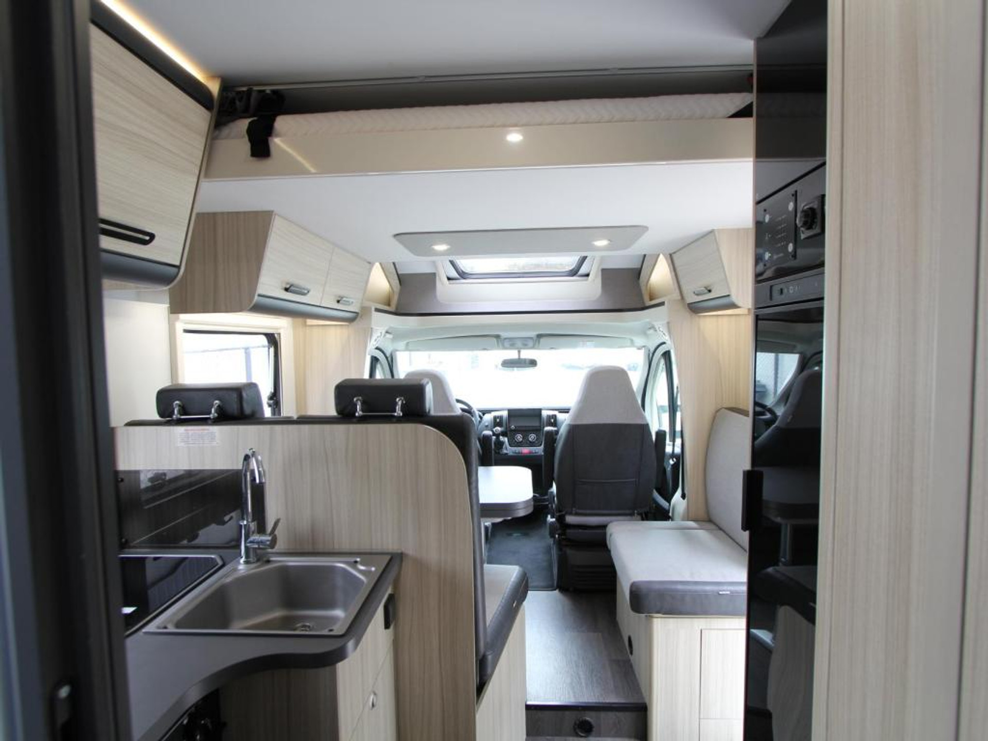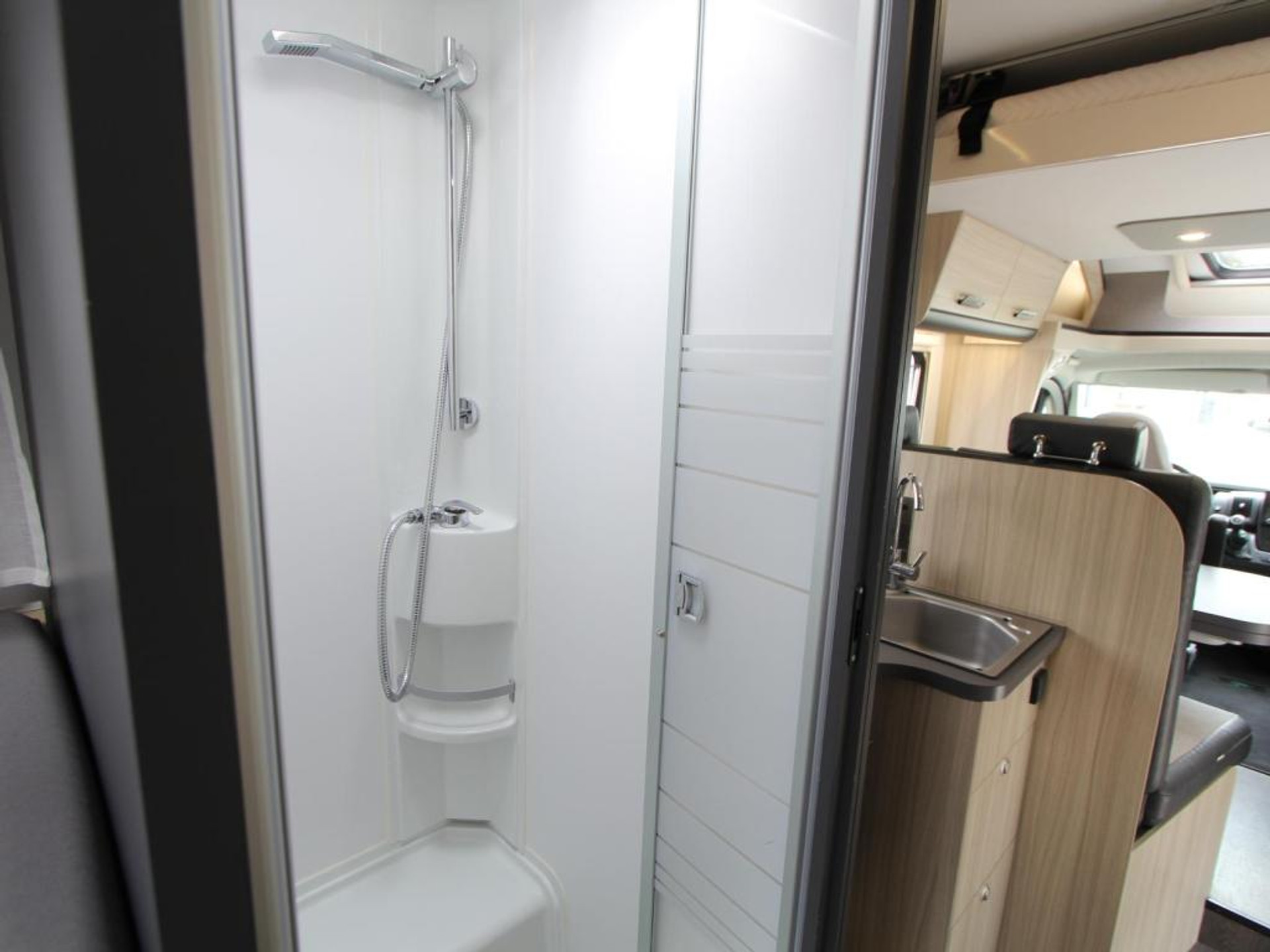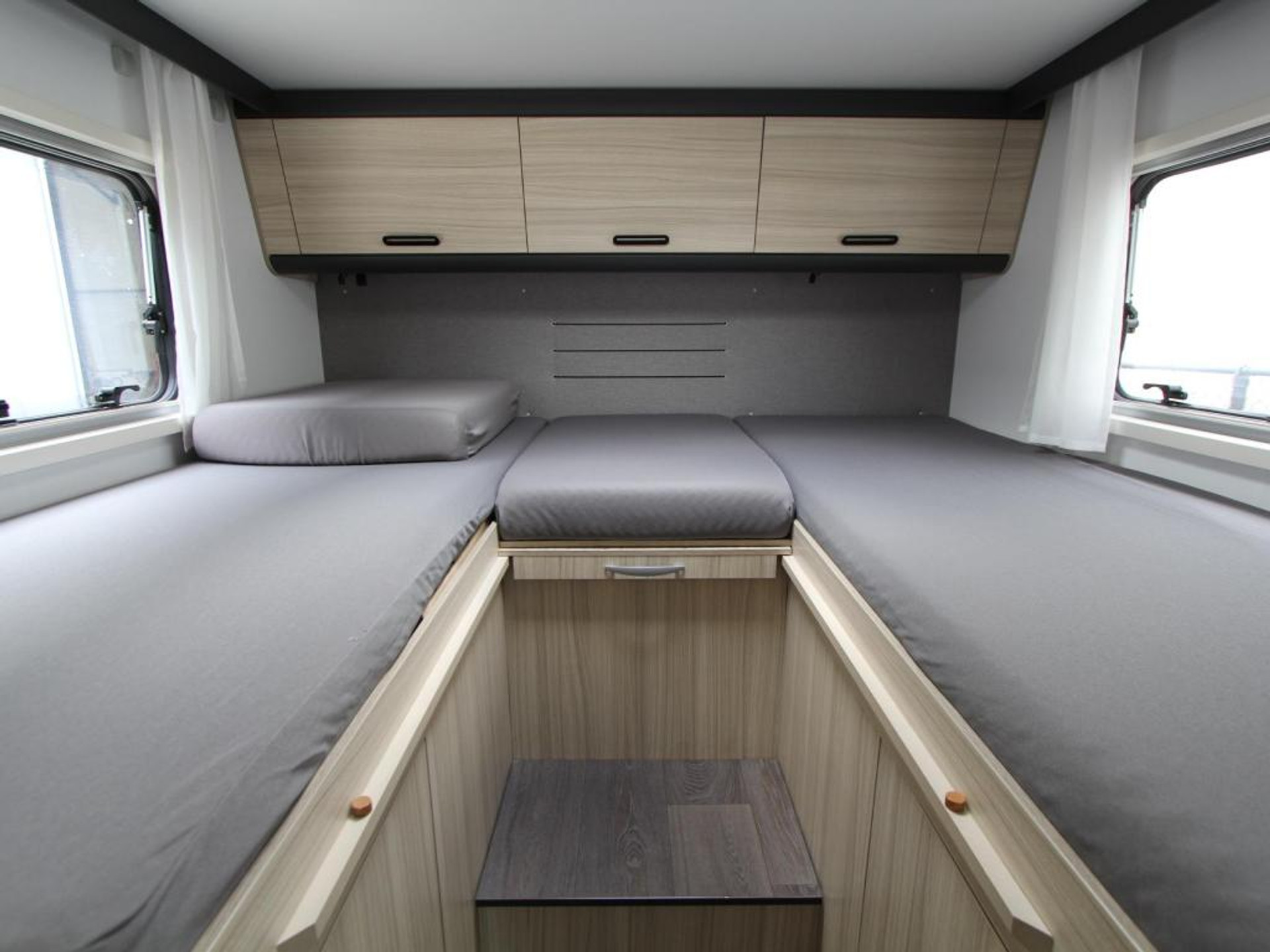 Het interieur beschikt over een ruim tweepersoonsbed in de lengte en een handig ruimtebesparend hefbed boven de zitgroep, beide voorzien van comfortabele lattenbodems en traagschuimmatrassen. In de badkamer vindt u een wastafel, een cassettetoilet en een douchecabine, zodat u onderweg altijd lekker kunt opfrissen.
