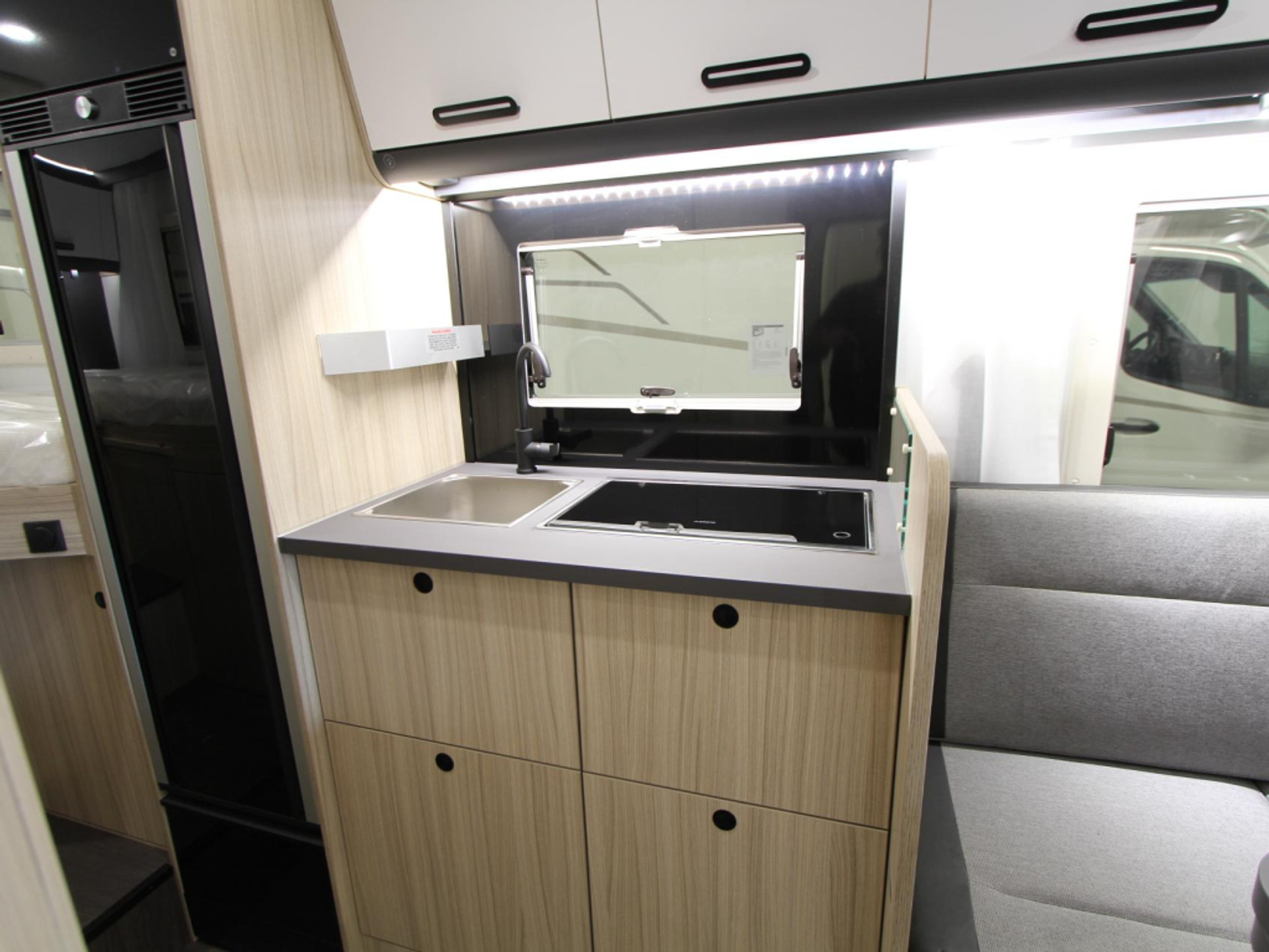 De centraal geplaatste keuken is voorzien van een 2-pits kooktoestel, spoelbak met kraan, en een 10-liter boiler voor warm water.