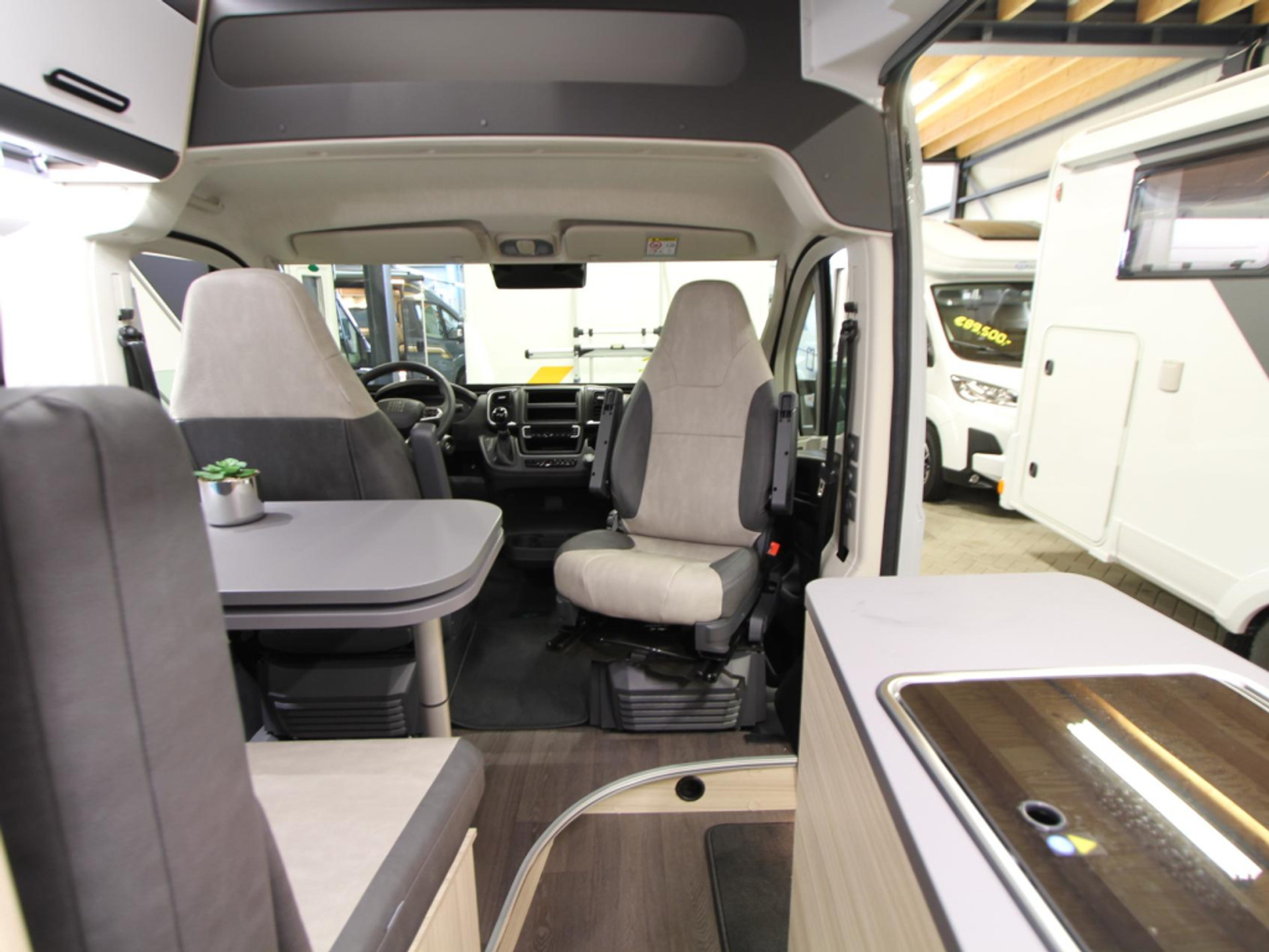 Binnen vindt u een gezellige treinzit, die tevens dienst kan doen als extra slaapgelegenheid. De middenkeuken is praktisch ingericht en voorzien van een 2-pits kooktoestel, spoelbak en kraan. Dankzij de 10-liter boiler beschikt u snel over warm water. De ruime 84-liter koelkast met vriesvak biedt voldoende plek voor al uw boodschappen.