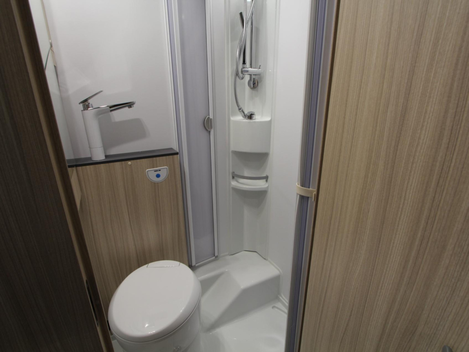 De badkamer is compleet uitgerust met wastafel, cassettetoilet en een doucheruimte — praktisch en comfortabel.
