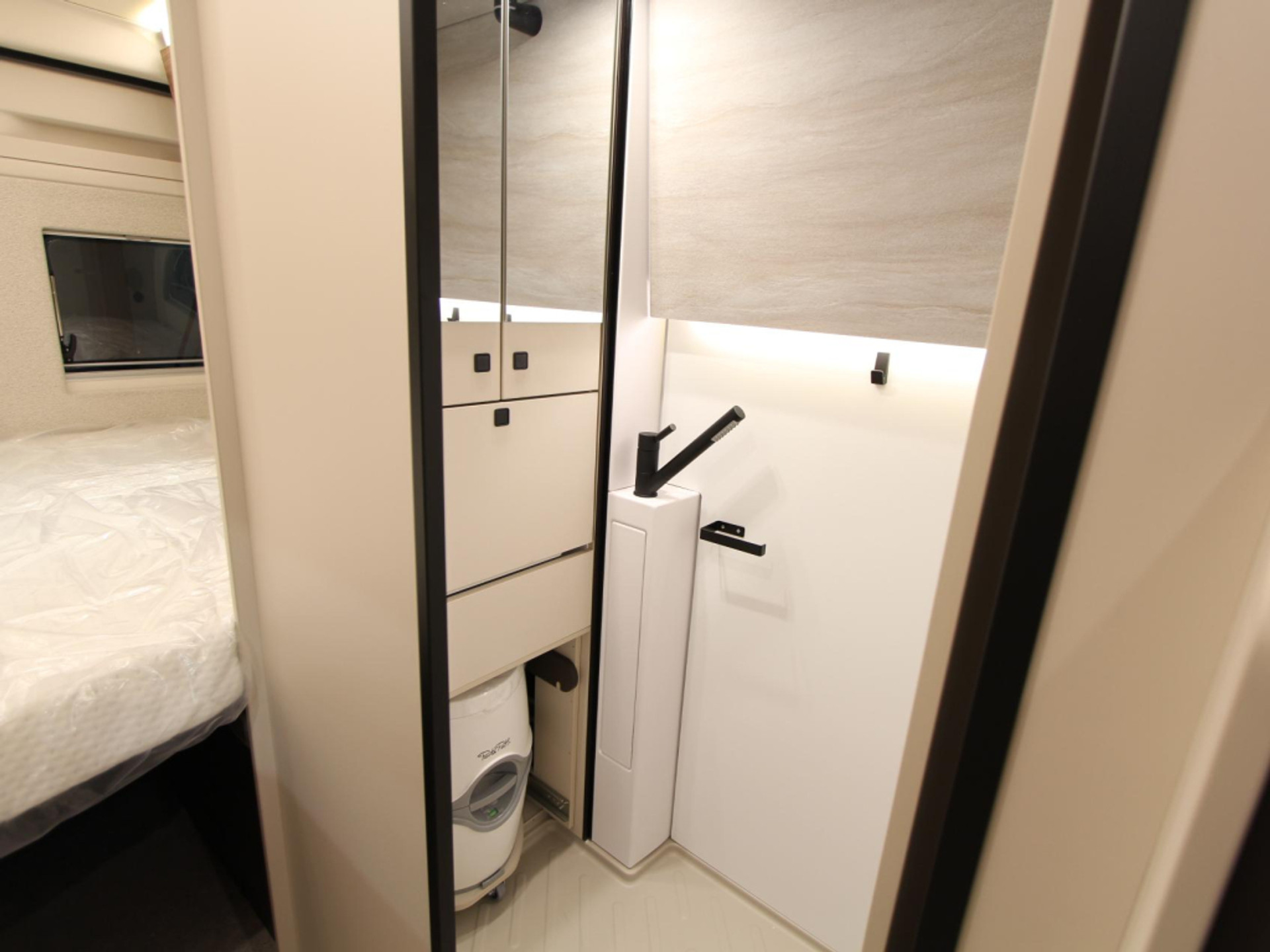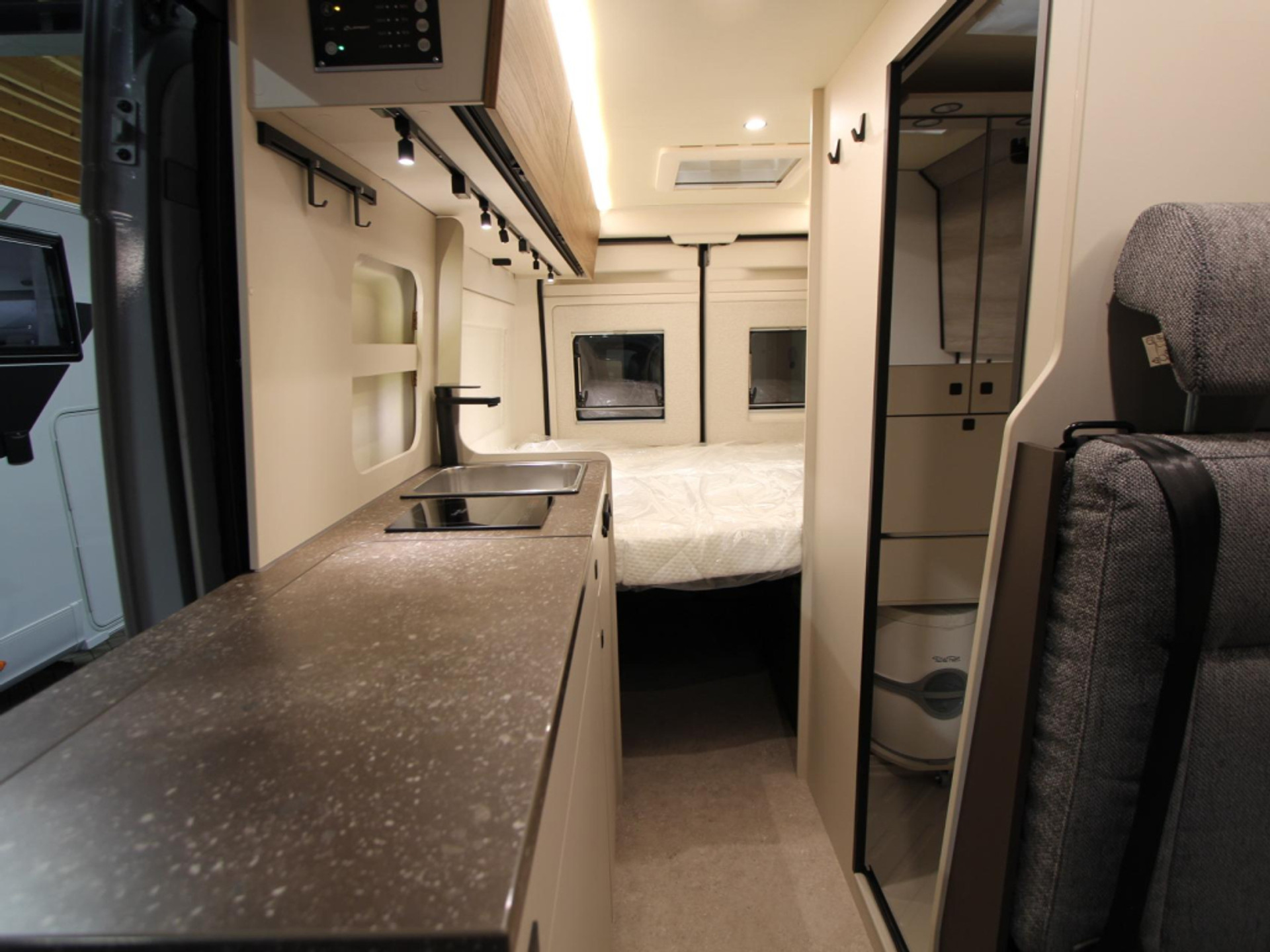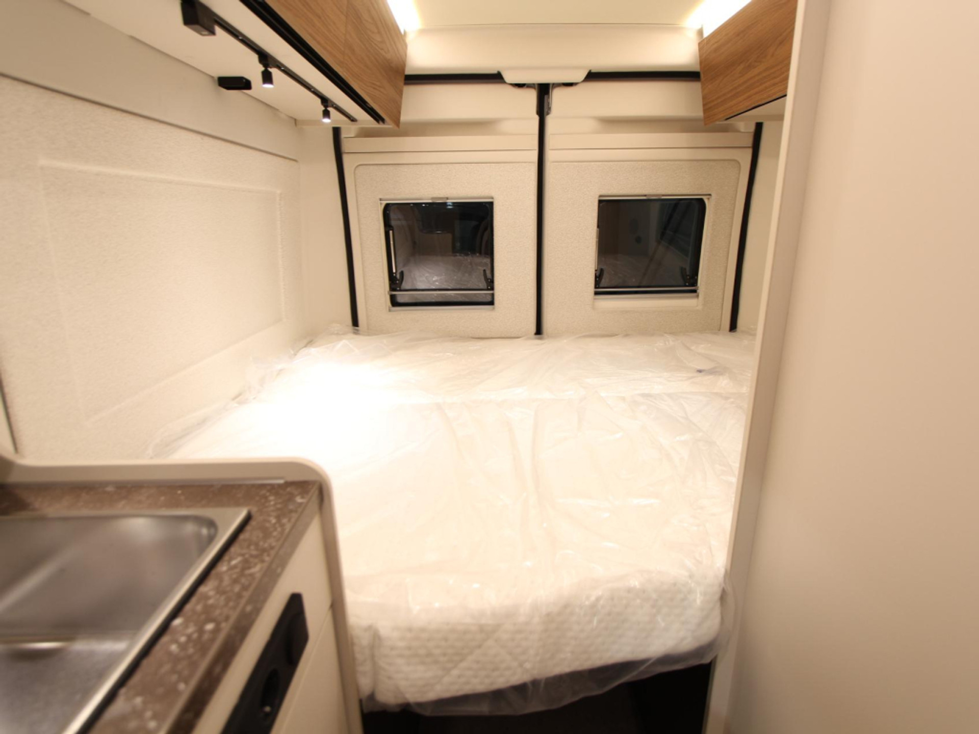 Achterin bevindt zich het comfortabele dwarsbed van 190 x 150 cm, geschikt voor twee personen. Het bed is voorzien van een hoogwaardig traagschuimmatras, wat garant staat voor een goede nachtrust.