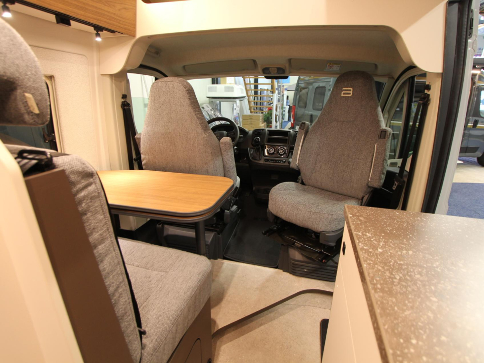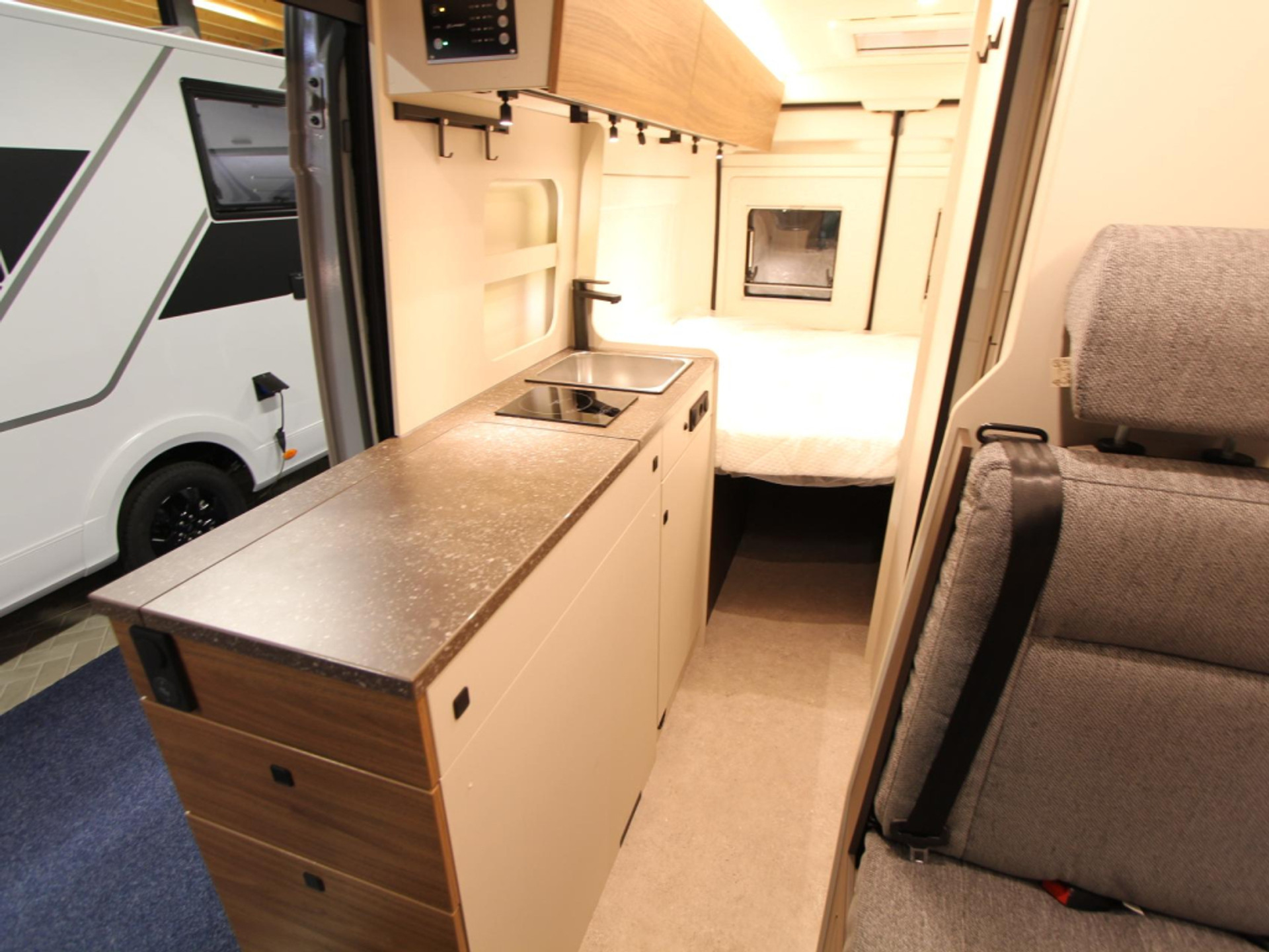 De camper beschikt over een gezellige treinzit, ideaal voor ontspannen momenten onderweg. De middenkeuken is praktisch ingericht met een 32 liter ladekoelkast en een slimme snijplank/spoelbakdeksel.
